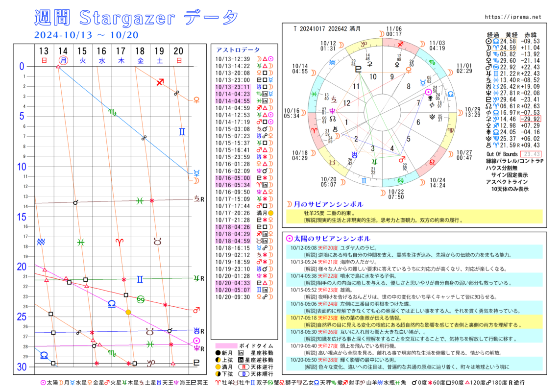 グラフィック天文歴 ブログ よかったらシェアしてね! URLをコピーしました! 週刊SGデータ10/06~10/13 週間SGデータ2024/10/20~27 この記事を書いた人 愛プレマ 40代半ばより占星術を研究しています。途中仕事や子育てと学童の父母活動で進まない時期もありました。HPも一度は閉鎖してやり直している途中です。2022年より占いを専業として活動を再開しています。これからも色々な発表の場で活動したいと思います。 関連記事 30年グラフィック天文暦 1,850年から2029年 2025年11月12日 占星術の構造から見る「好きなこと」と「収入」のギャップ 2025年11月9日 モーニングページとカタルシス 2025年11月9日 マインドセットとは? 2025年10月25日 お金のブロック、ホロスコープからの原因発見とその外し方 2025年10月25日 トランプ大統領と高市新総理,サビアンオラクルで占ってみた 2025年10月24日 高市首相をサビアンオラクルで占ってみました。 2025年10月22日 2025年、月別グラフィック天文暦 2025年10月22日 コメント コメントする コメントをキャンセルコメント ※ 名前 ※ メール ※ サイト 次回のコメントで使用するためブラウザーに自分の名前、メールアドレス、サイトを保存する。 Δ