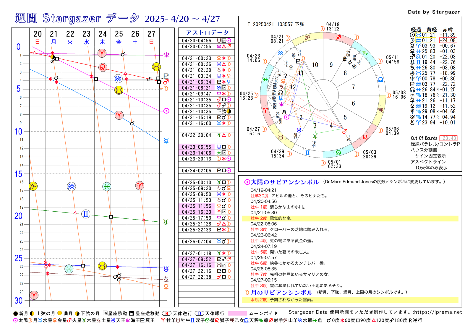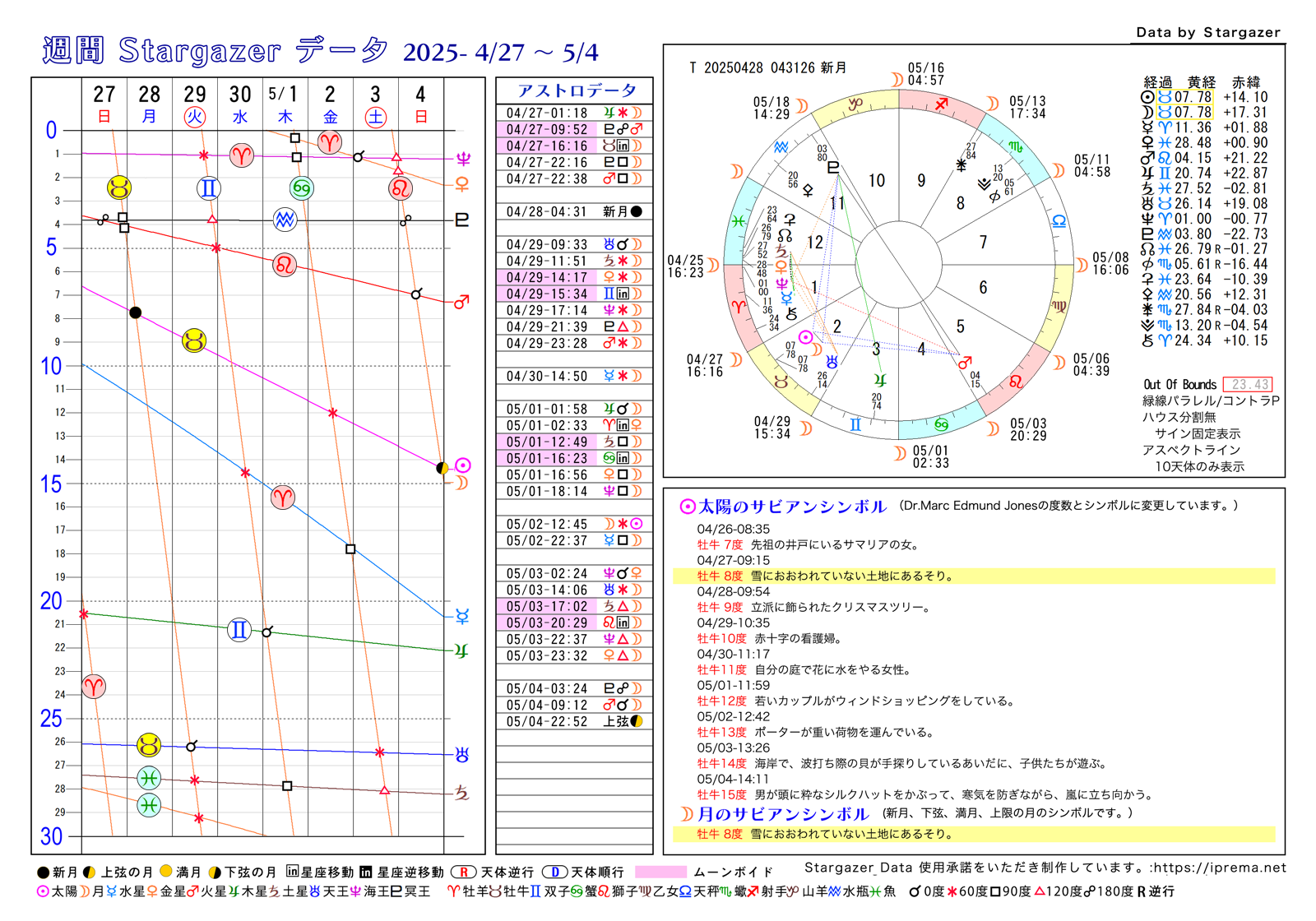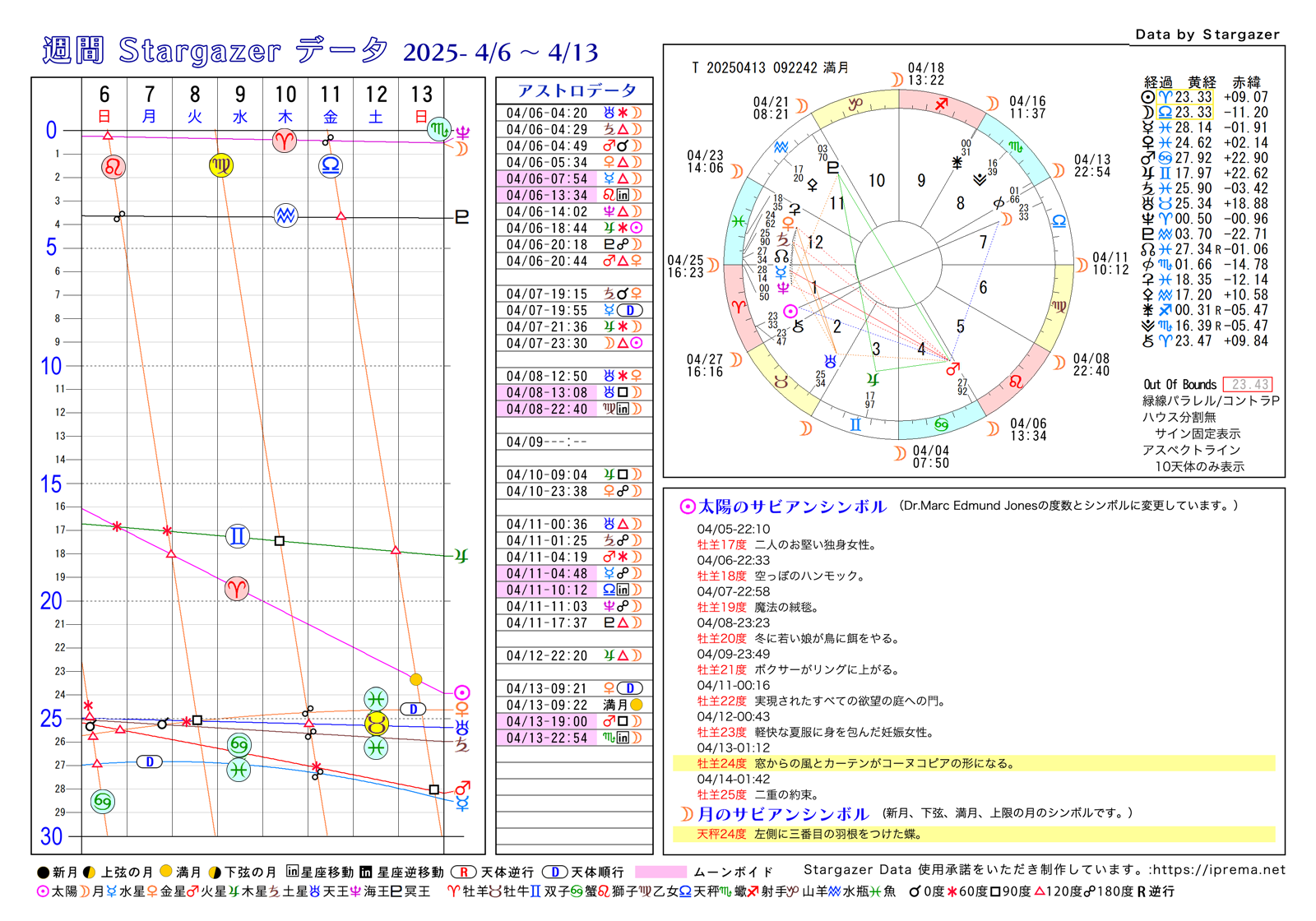 目次週間Stargazerデータ、2025年4月 週間SGデータ よかったらシェアしてね! URLをコピーしました! 週間Stargazerデータ、2025年3月 週間Stargazerデータ、2025年5月 この記事を書いた人 愛プレマ 40代半ばより占星術を研究しています。途中仕事や子育てと学童の父母活動で進まない時期もありました。HPも一度は閉鎖してやり直している途中です。2022年より占いを専業として活動を再開しています。これからも色々な発表の場で活動したいと思います。 関連記事 週間Stargazerデータ、2025年9月 2025年6月16日 週間Stargazerデータ、2025年7月 2025年5月2日 週間Stargazerデータ、2025年6月 2025年5月2日 週間Stargazerデータ、2025年5月 2025年4月8日 週間Stargazerデータ、2025年3月 2025年3月1日 週間Stargazerデータ、2025年2月 2025年1月6日 週間Stargazerデータ、2025年1月 2024年12月21日 週間SGデータ 2024年12/1から2025年1/5 2024年11月29日 コメント コメントする コメントをキャンセルコメント ※ 名前 ※ メール ※ サイト 次回のコメントで使用するためブラウザーに自分の名前、メールアドレス、サイトを保存する。 Δ