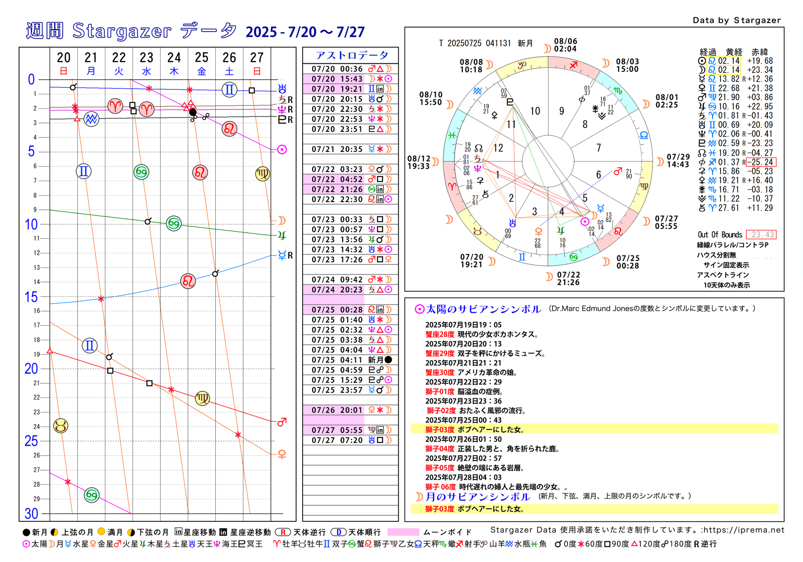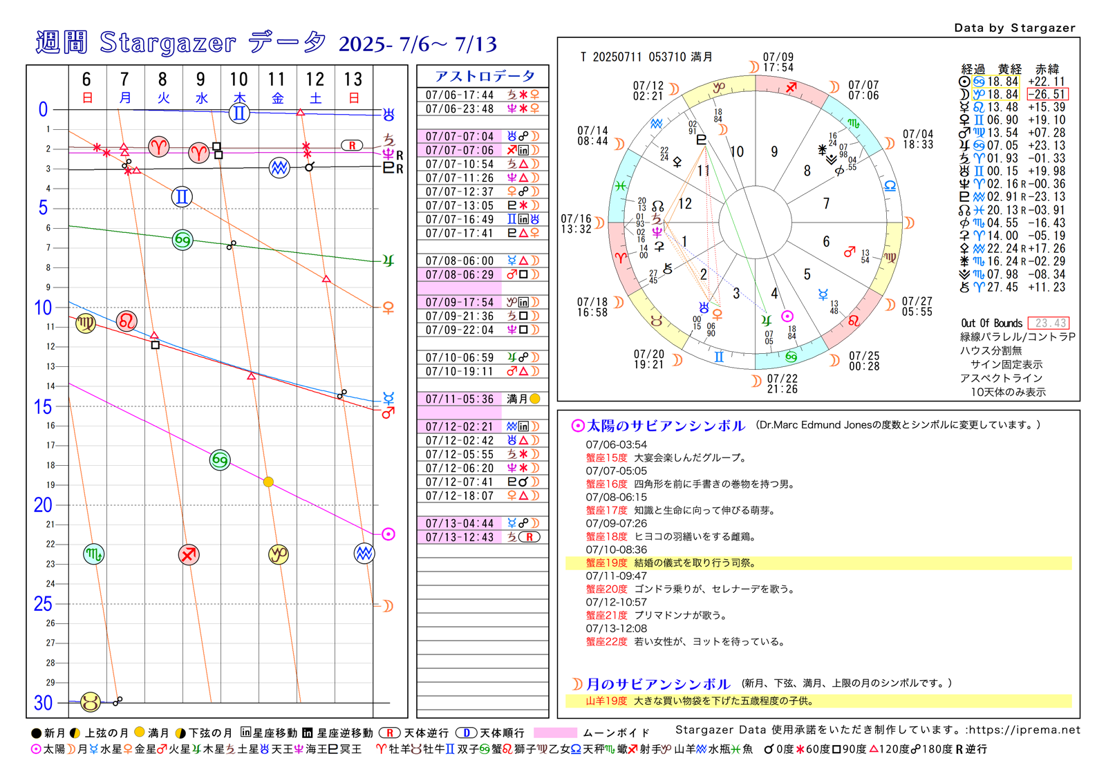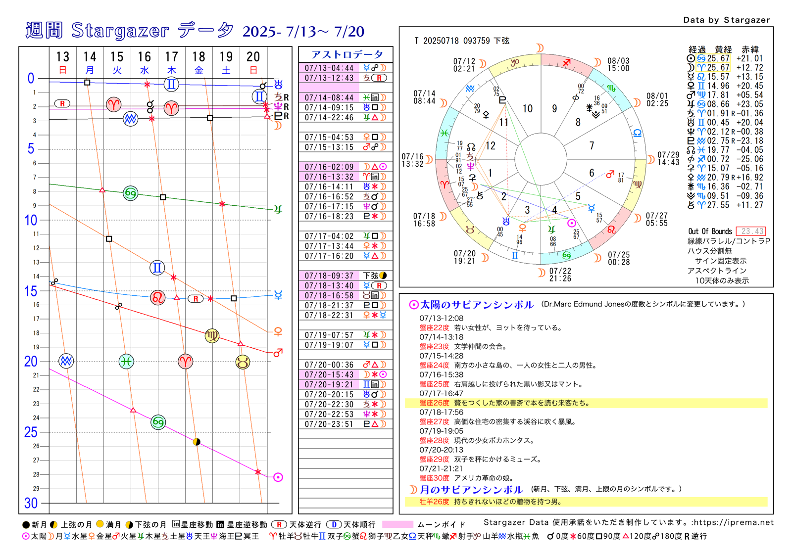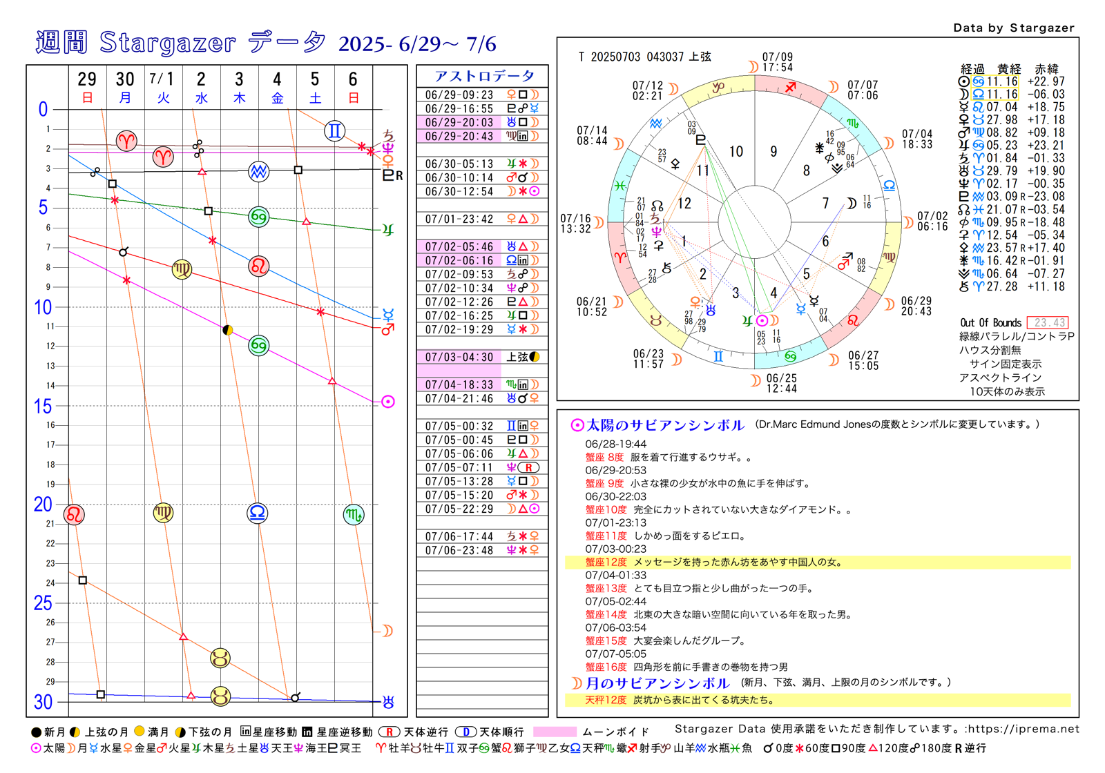 目次週間Stargazerデータ、2025年7月 / 週間SGデータ よかったらシェアしてね! URLをコピーしました! 週間Stargazerデータ、2025年6月 プラシーダス・ハウスシステムの仕組み この記事を書いた人 愛プレマ 40代半ばより占星術を研究しています。途中仕事や子育てと学童の父母活動で進まない時期もありました。HPも一度は閉鎖してやり直している途中です。2022年より占いを専業として活動を再開しています。これからも色々な発表の場で活動したいと思います。 関連記事 週間Stargazerデータ、2025年9月 2025年6月16日 週間Stargazerデータ、2025年6月 2025年5月2日 週間Stargazerデータ、2025年5月 2025年4月8日 週間Stargazerデータ、2025年4月 2025年3月30日 週間Stargazerデータ、2025年3月 2025年3月1日 週間Stargazerデータ、2025年2月 2025年1月6日 週間Stargazerデータ、2025年1月 2024年12月21日 週間SGデータ 2024年12/1から2025年1/5 2024年11月29日 コメント コメントする コメントをキャンセルコメント ※ 名前 ※ メール ※ サイト 次回のコメントで使用するためブラウザーに自分の名前、メールアドレス、サイトを保存する。 Δ