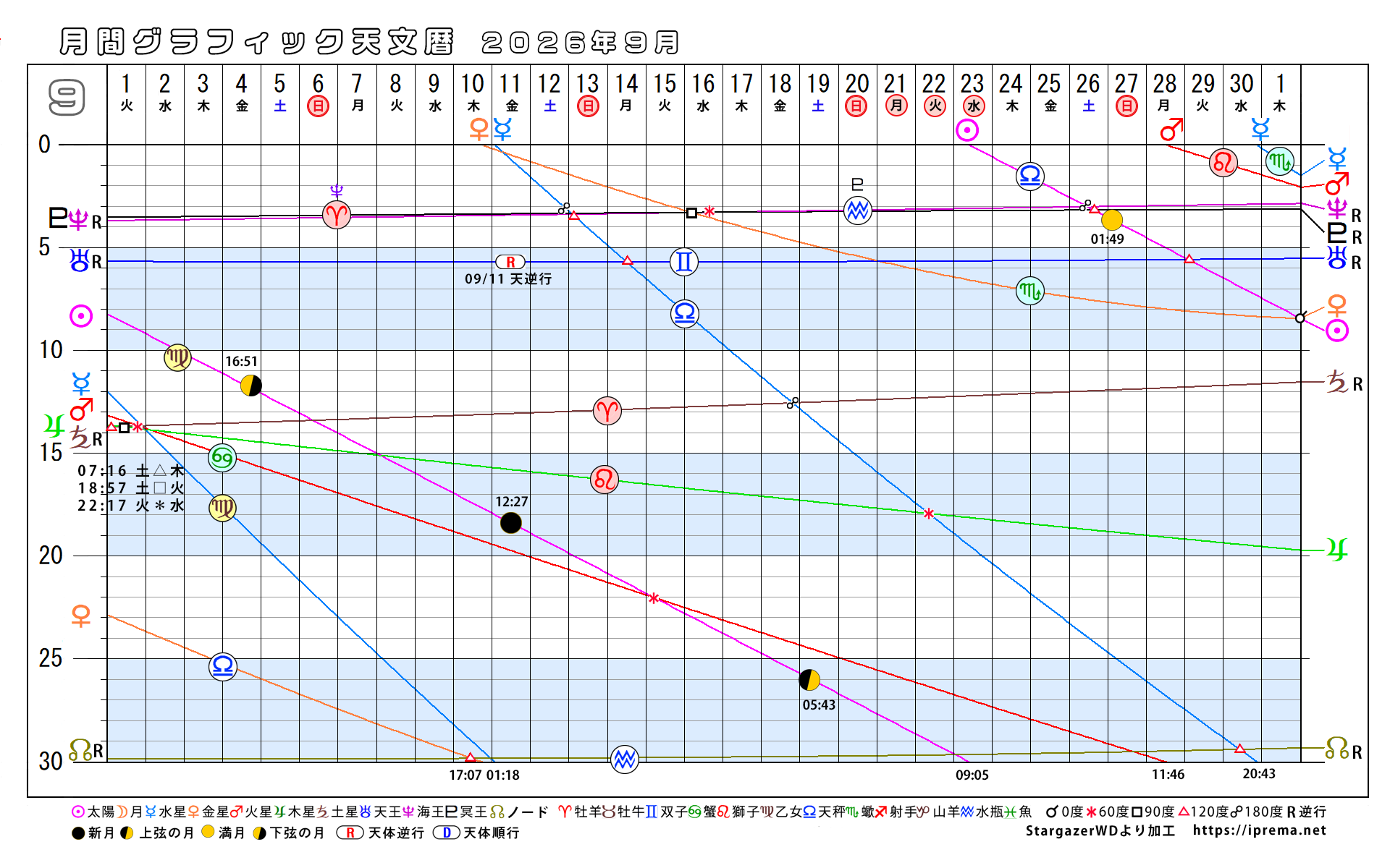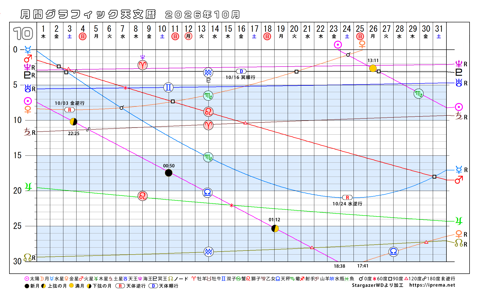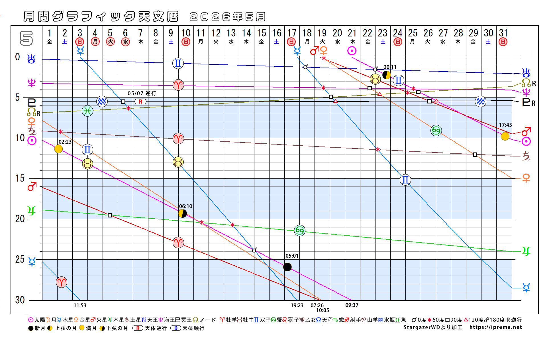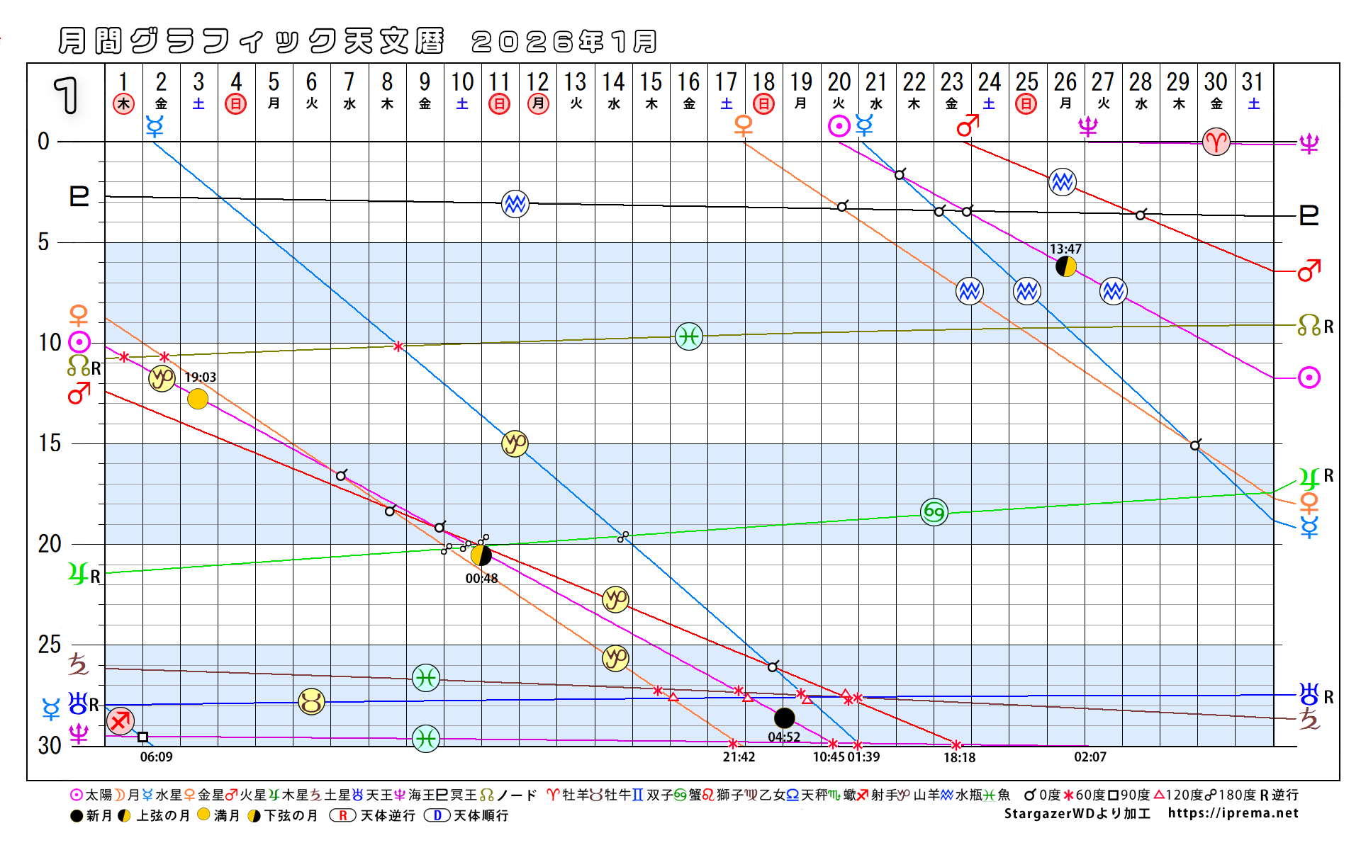 目次2026年、月別グラフィック天文暦 グラフィック天文歴 よかったらシェアしてね! URLをコピーしました! トランプ大統領と安部昭惠さんサビアンオラクルで占ってみた 2025年、月別グラフィック天文暦 この記事を書いた人 愛プレマ 40代半ばより占星術を研究しています。途中仕事や子育てと学童の父母活動で進まない時期もありました。HPも一度は閉鎖してやり直している途中です。2022年より占いを専業として活動を再開しています。これからも色々な発表の場で活動したいと思います。 関連記事 30年グラフィック天文暦 1,850年から2029年 2025年11月12日 2025年、月別グラフィック天文暦 2025年10月22日 2025-9/6~2026-2/4の天王星逆行の意味 2025年9月6日 月間グラフィック天文暦2025/9月から12月 2025年8月30日 月間グラフィック天文暦 2025年5月から12月 2025年5月29日 4ヶ月グラフィック天文暦 2025 2025年4月29日 週間SGデータ2024/11/10~11/17 2024年11月8日 週間SGデータ2024/11/3~11/10 2024年11月1日 コメント コメントする コメントをキャンセルコメント ※ 名前 ※ メール ※ サイト 次回のコメントで使用するためブラウザーに自分の名前、メールアドレス、サイトを保存する。 Δ