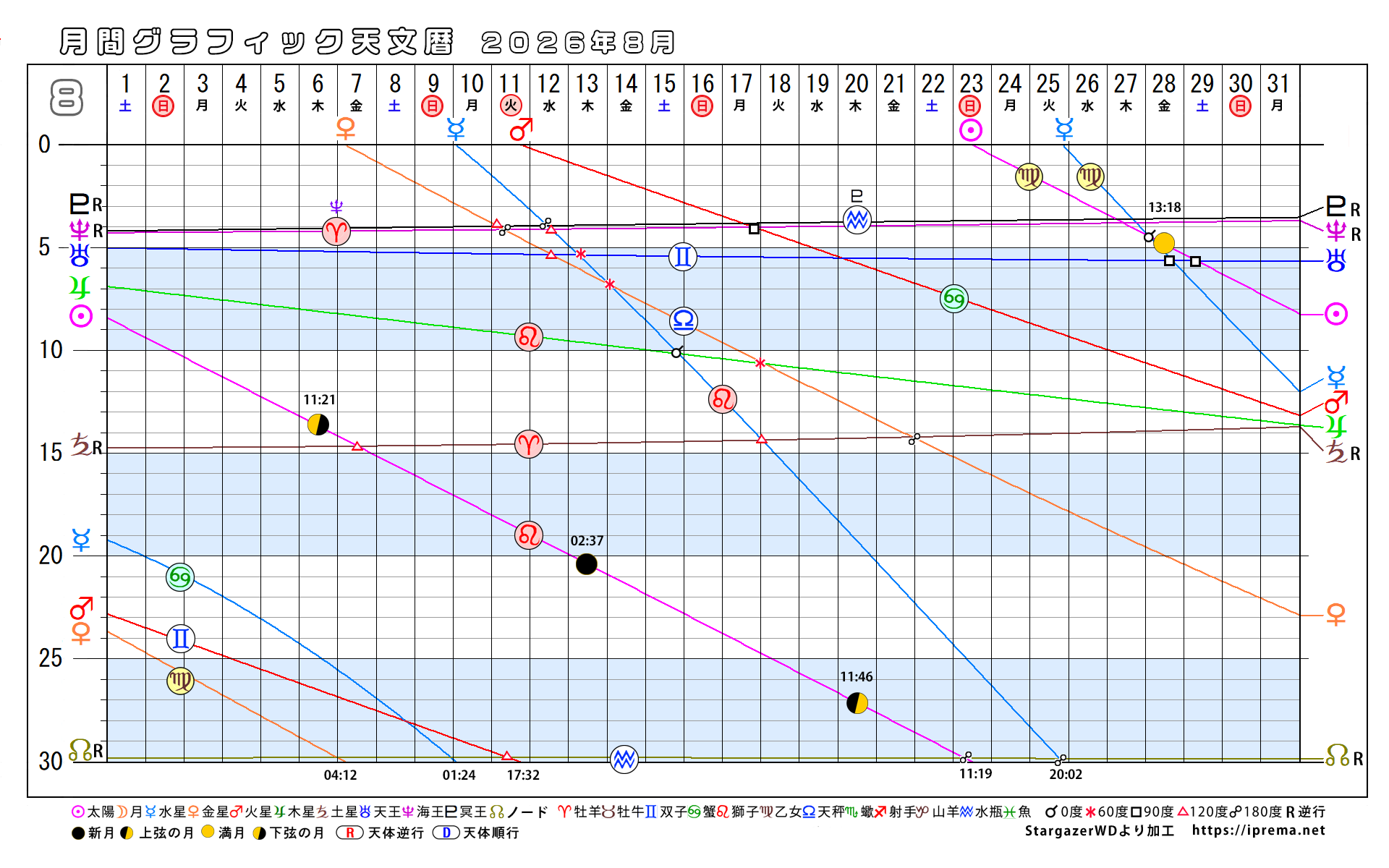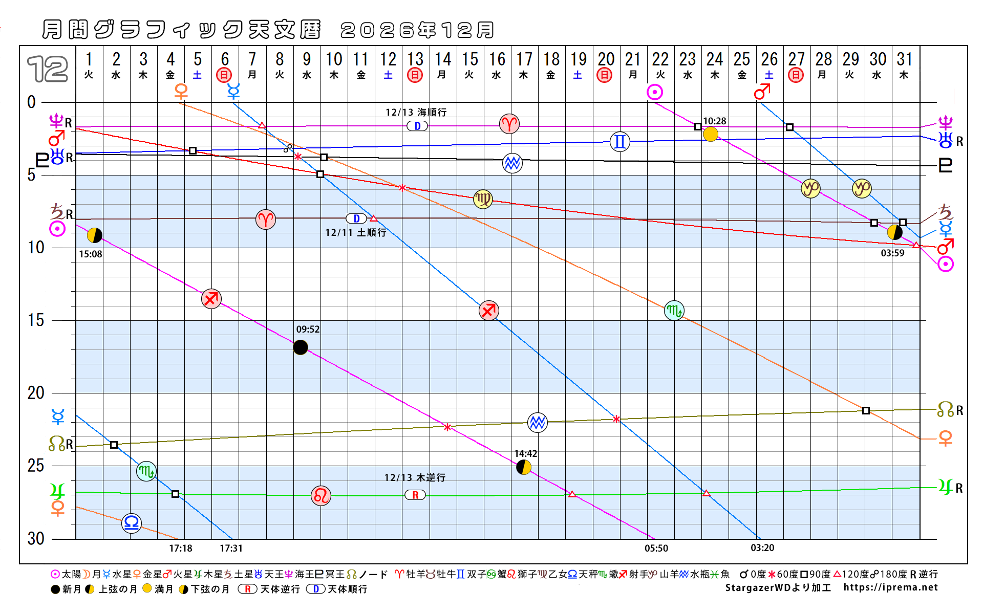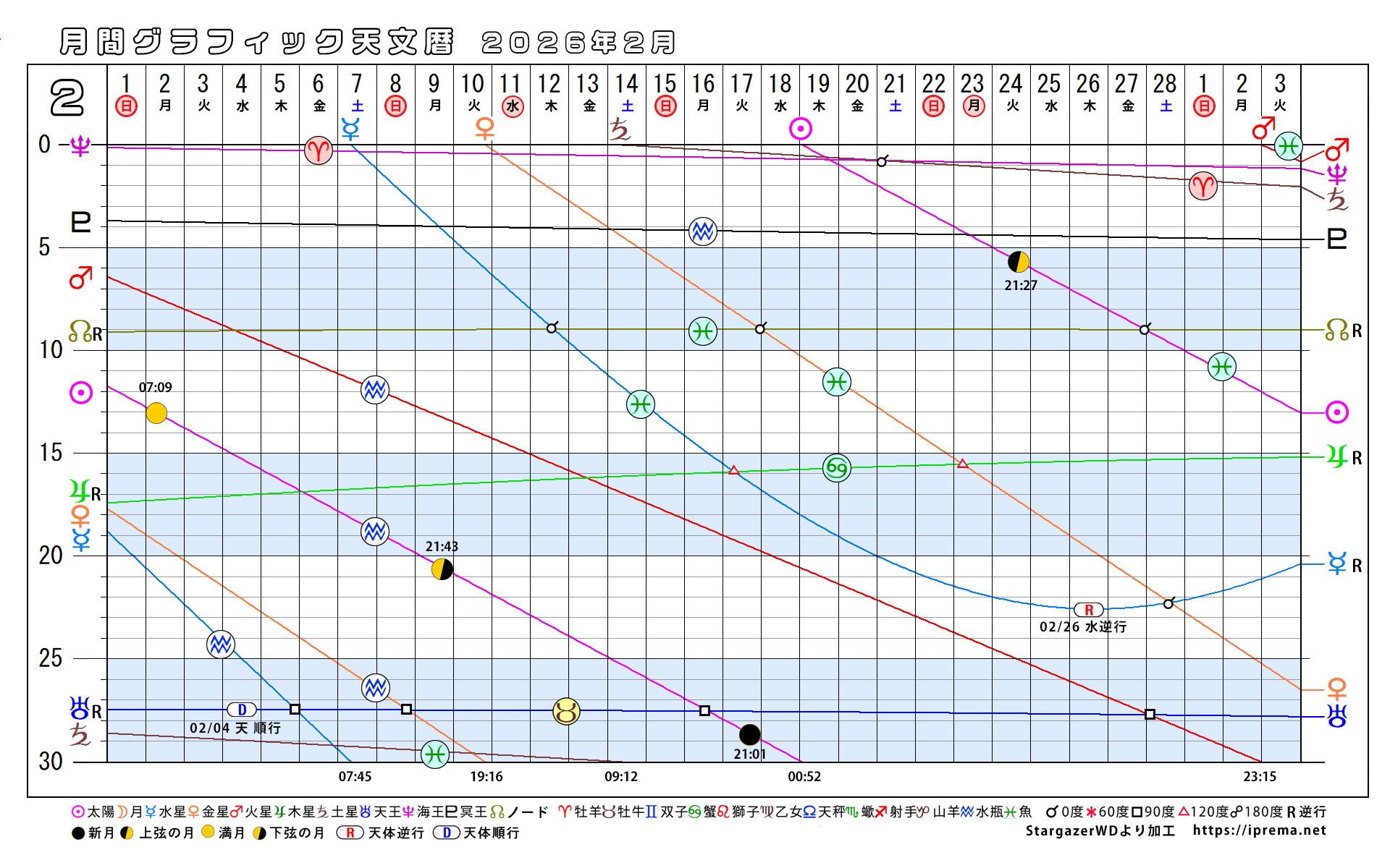 目次2026年、月別グラフィック天文暦 グラフィック天文歴 よかったらシェアしてね! URLをコピーしました! トランプ大統領と安部昭惠さんサビアンオラクルで占ってみた 2025年、月別グラフィック天文暦 この記事を書いた人 愛プレマ 40代半ばより占星術を研究しています。途中仕事や子育てと学童の父母活動で進まない時期もありました。HPも一度は閉鎖してやり直している途中です。2022年より占いを専業として活動を再開しています。これからも色々な発表の場で活動したいと思います。 関連記事 30年グラフィック天文暦 1,850年から2029年 2025年11月12日 2025年、月別グラフィック天文暦 2025年10月22日 2025-9/6~2026-2/4の天王星逆行の意味 2025年9月6日 月間グラフィック天文暦2025/9月から12月 2025年8月30日 月間グラフィック天文暦 2025年5月から12月 2025年5月29日 4ヶ月グラフィック天文暦 2025 2025年4月29日 週間SGデータ2024/11/10~11/17 2024年11月8日 週間SGデータ2024/11/3~11/10 2024年11月1日 コメント コメントする コメントをキャンセルコメント ※ 名前 ※ メール ※ サイト 次回のコメントで使用するためブラウザーに自分の名前、メールアドレス、サイトを保存する。 Δ