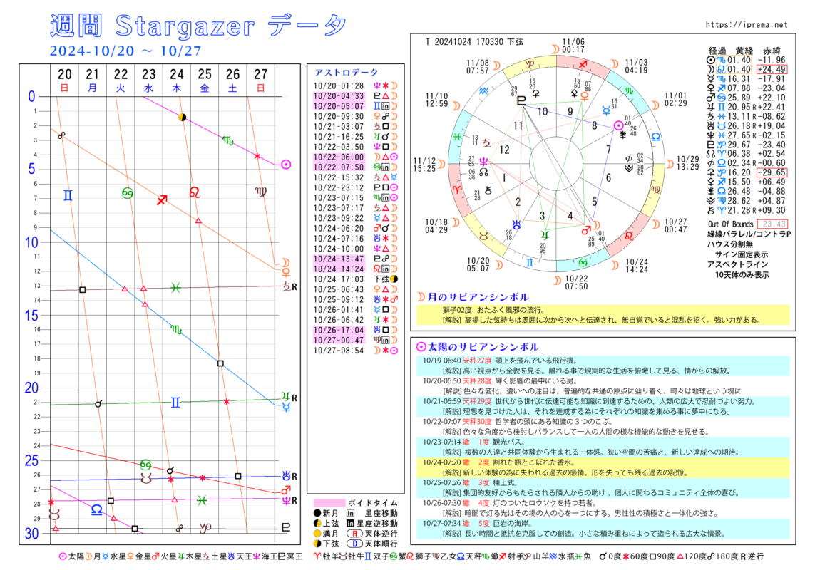 グラフィック天文歴 よかったらシェアしてね! URLをコピーしました! 週間SGデータ2024/10/13~20 週間SGデータ2024/10/27~11/3 この記事を書いた人 愛プレマ 40代半ばより占星術を研究しています。途中仕事や子育てと学童の父母活動で進まない時期もありました。HPも一度は閉鎖してやり直している途中です。2022年より占いを専業として活動を再開しています。これからも色々な発表の場で活動したいと思います。 関連記事 2025年、月別グラフィック天文暦 2025年10月22日 2026年、月別グラフィック天文暦 2025年10月21日 2025-9/6~2026-2/4の天王星逆行の意味 2025年9月6日 月間グラフィック天文暦2025/9月から12月 2025年8月30日 月間グラフィック天文暦 2025年5月から12月 2025年5月29日 4ヶ月グラフィック天文暦 2025 2025年4月29日 週間SGデータ2024/11/10~11/17 2024年11月8日 週間SGデータ2024/11/3~11/10 2024年11月1日
