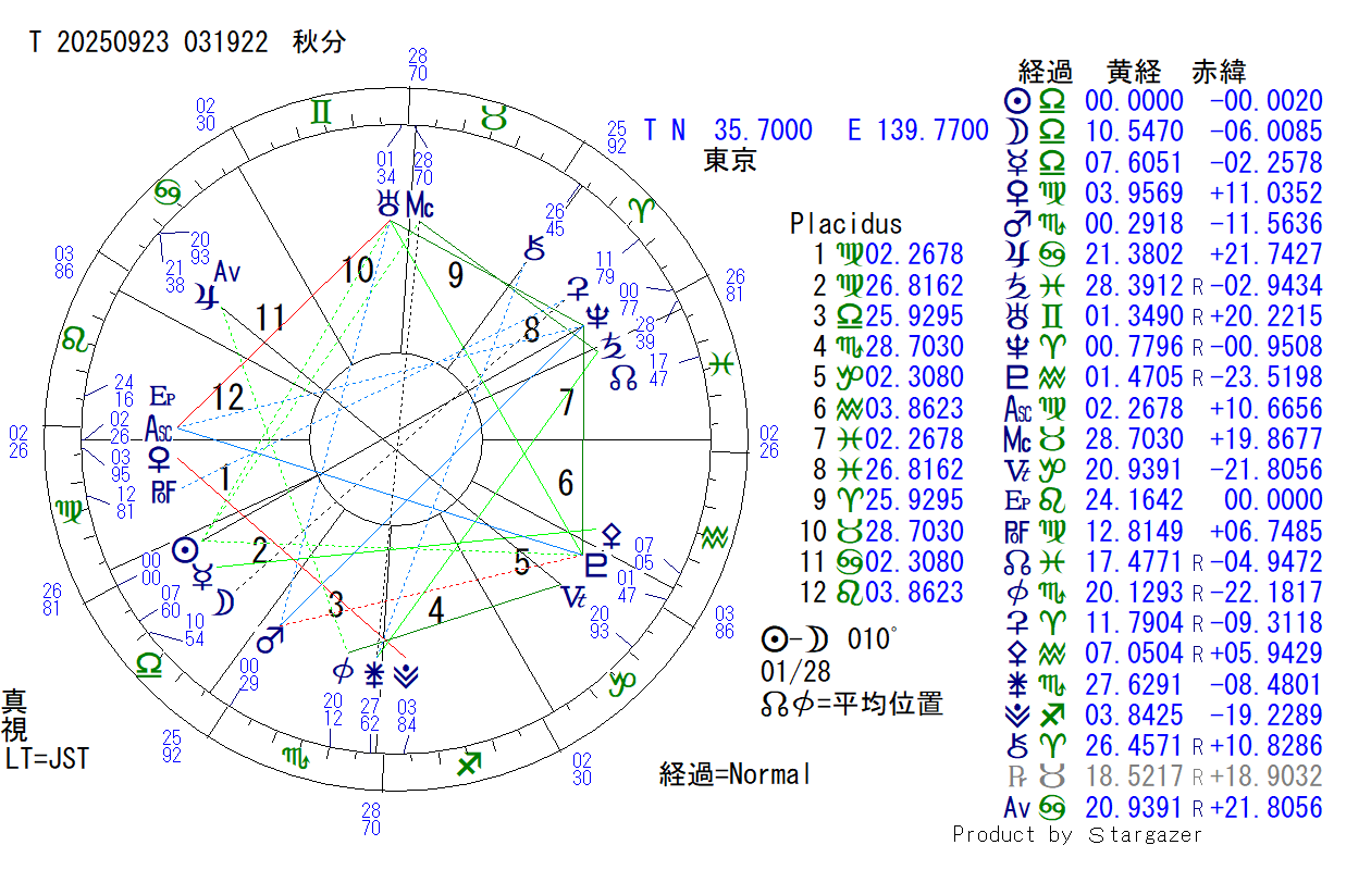 今回のホロスコープは、天秤座に太陽と月、水星、MCが集中していることが大きな特徴です。天秤座は「バランス」「調和」「人間関係」を司る星座であり、秋分の日という昼と夜の長さが等しくなるタイミングと相まって、「人生のバランスを再調整する時期」がテーマとなりそうです。