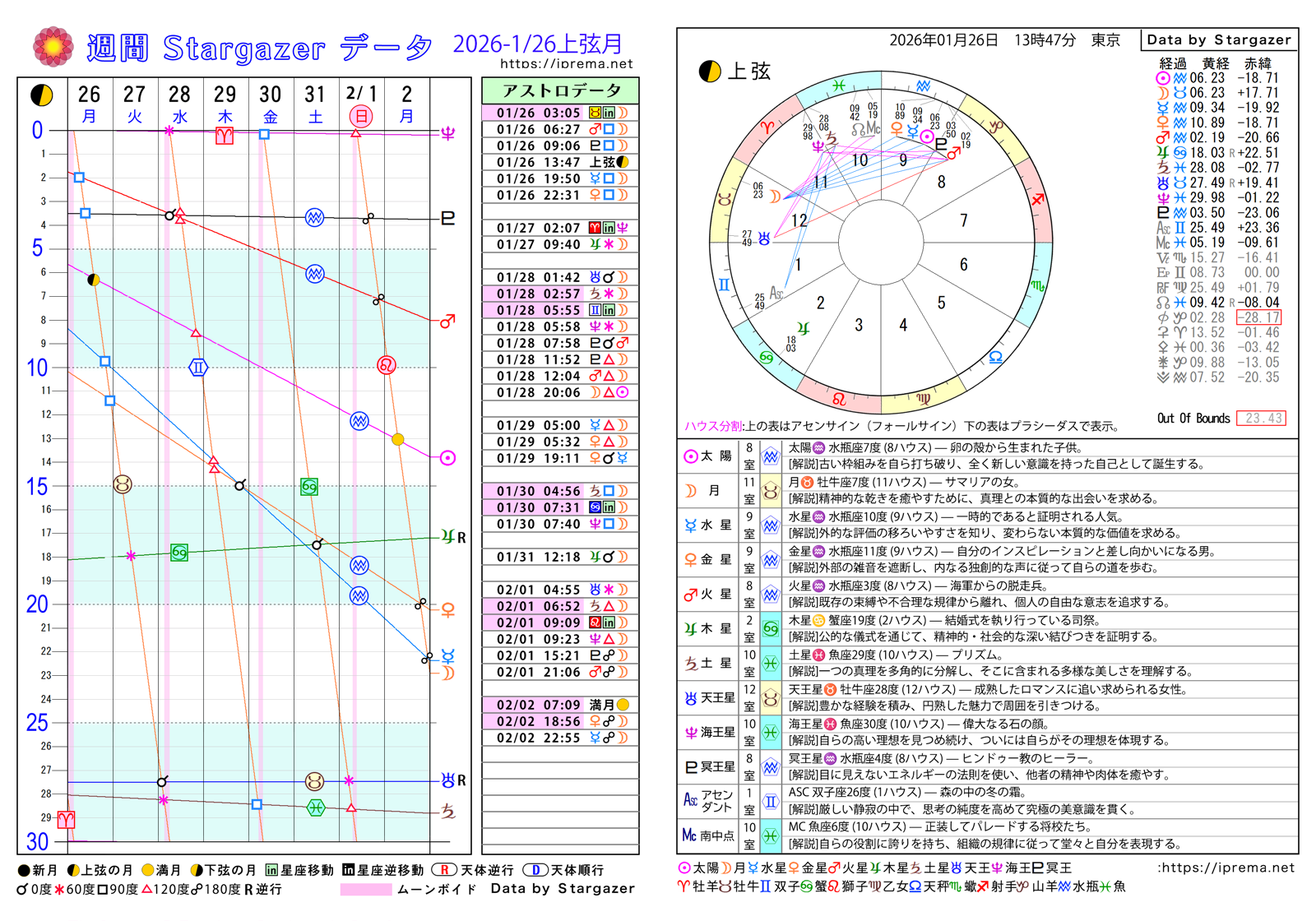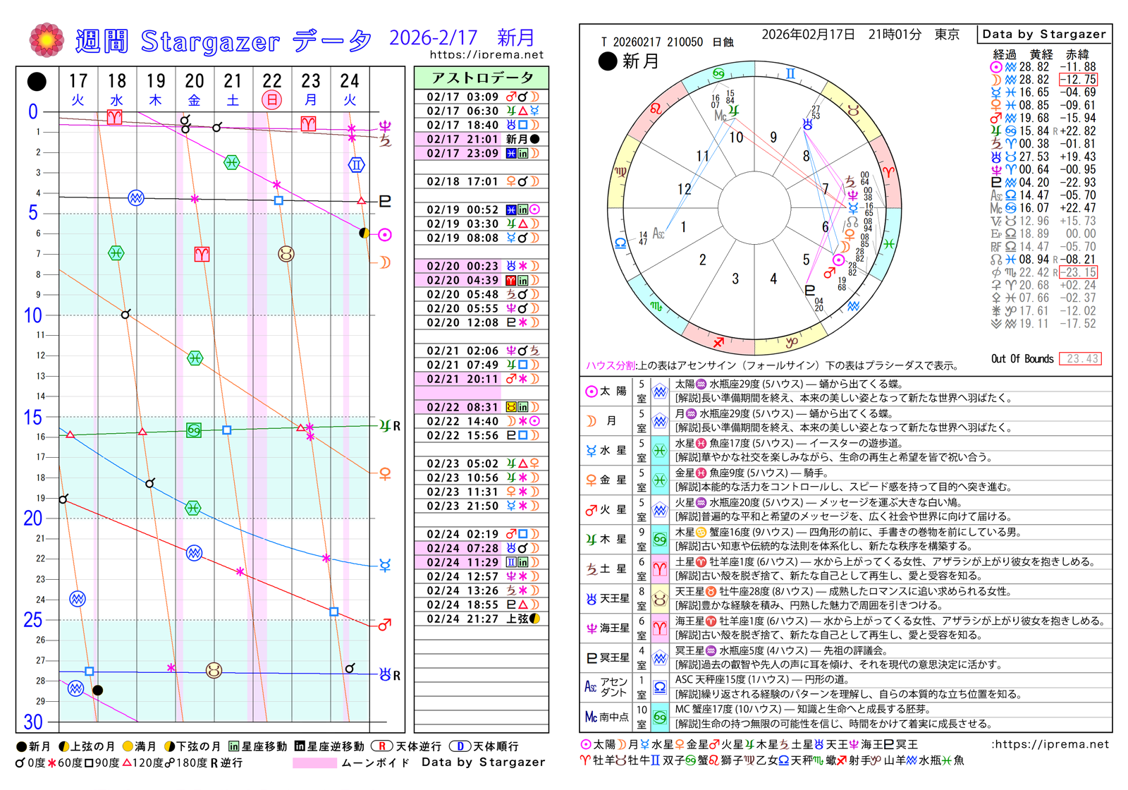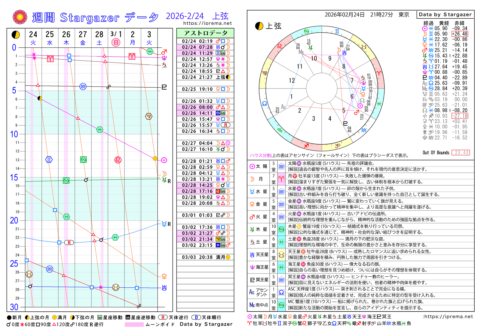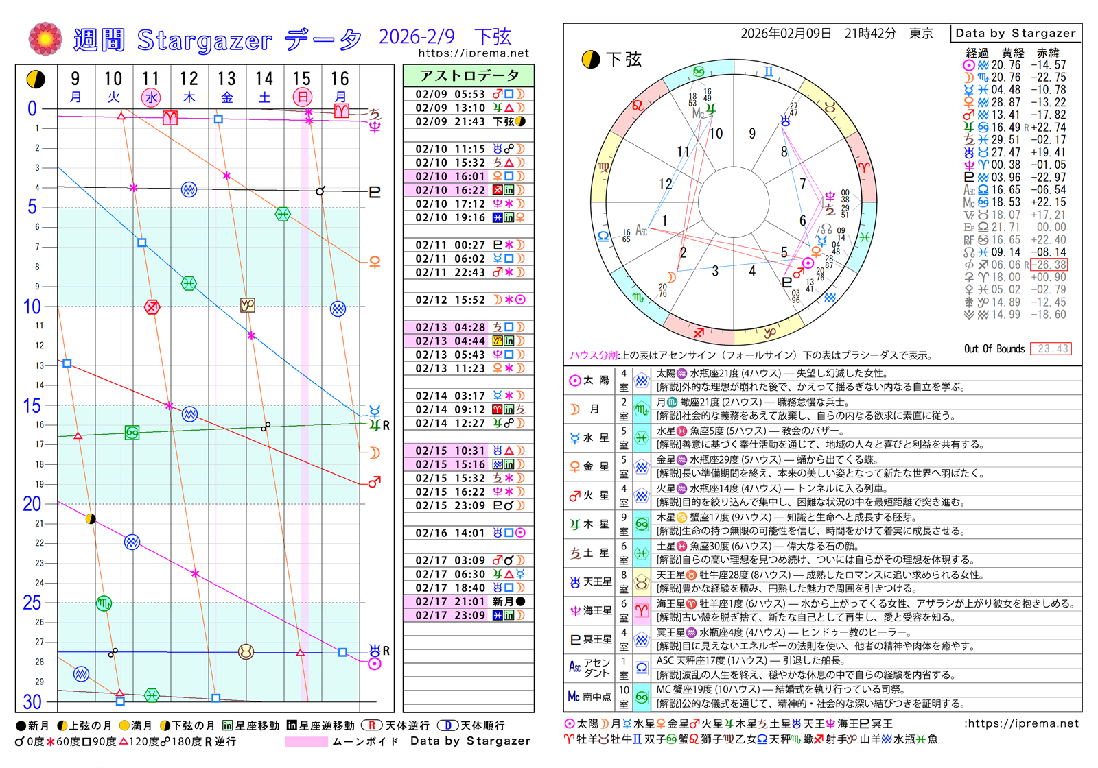 目次週間スターゲイザーデータ 2026/02 週間SGデータ よかったらシェアしてね! URLをコピーしました! 恒星の簡単な紹介 この記事を書いた人 愛プレマ 40代半ばより占星術を研究しています。途中仕事や子育てと学童の父母活動で進まない時期もありました。HPも一度は閉鎖してやり直している途中です。2022年より占いを専業として活動を再開しています。これからも色々な発表の場で活動したいと思います。 関連記事 週間スターゲイザーデータ 2026/01 2025年12月27日 週間Stargazerデータ、2025年9月 2025年6月16日 週間Stargazerデータ、2025年7月 2025年5月2日 週間Stargazerデータ、2025年6月 2025年5月2日 週間Stargazerデータ、2025年5月 2025年4月8日 週間Stargazerデータ、2025年4月 2025年3月30日 週間Stargazerデータ、2025年3月 2025年3月1日 週間Stargazerデータ、2025年2月 2025年1月6日 コメント コメントする コメントをキャンセルコメント ※ 名前 ※ メール ※ サイト 次回のコメントで使用するためブラウザーに自分の名前、メールアドレス、サイトを保存する。 Δ