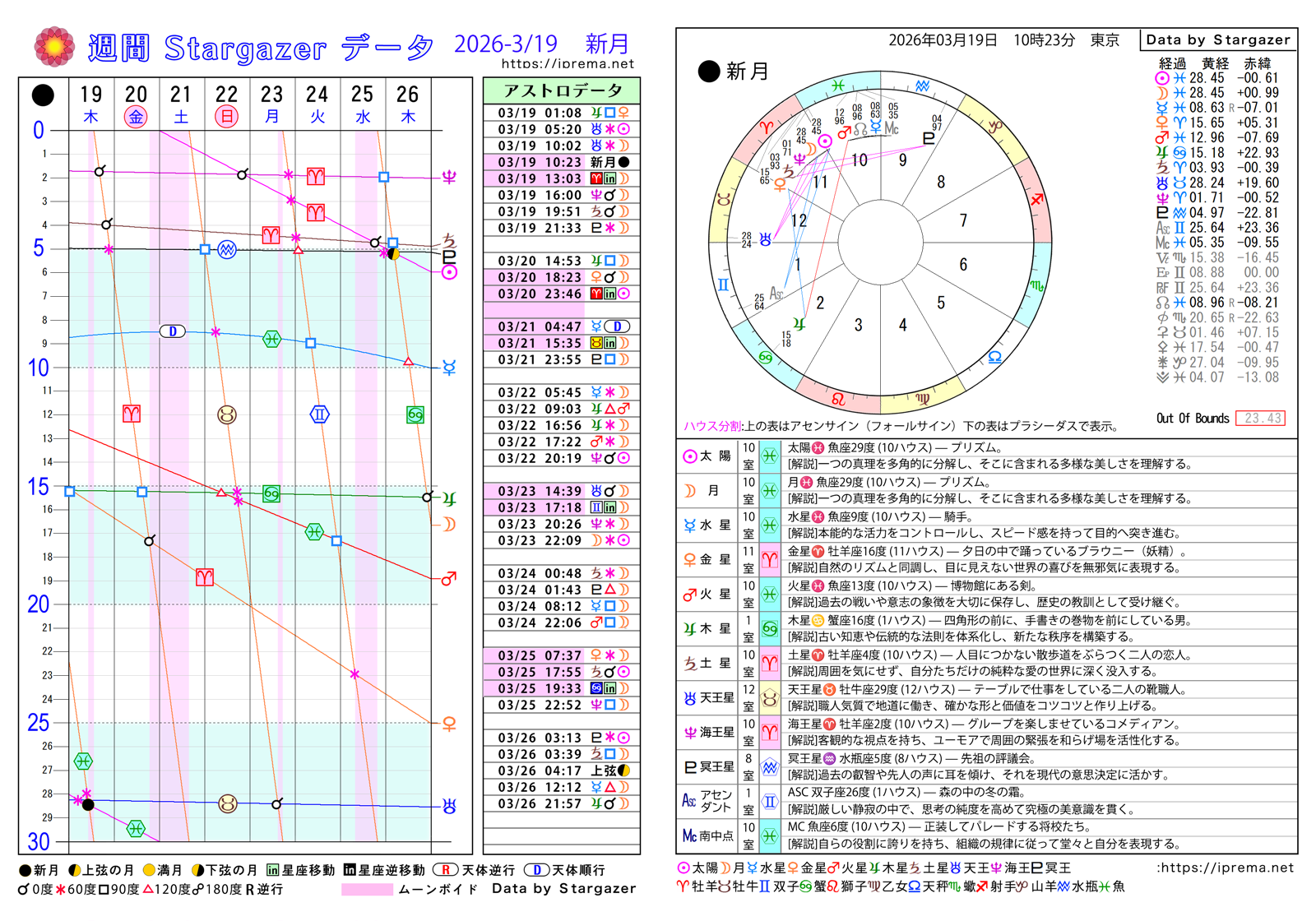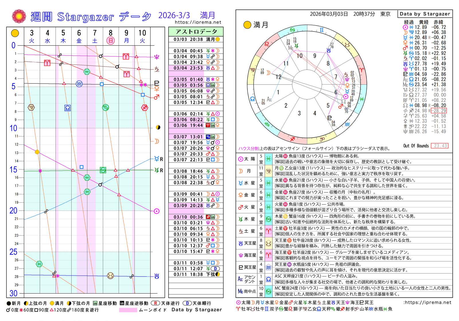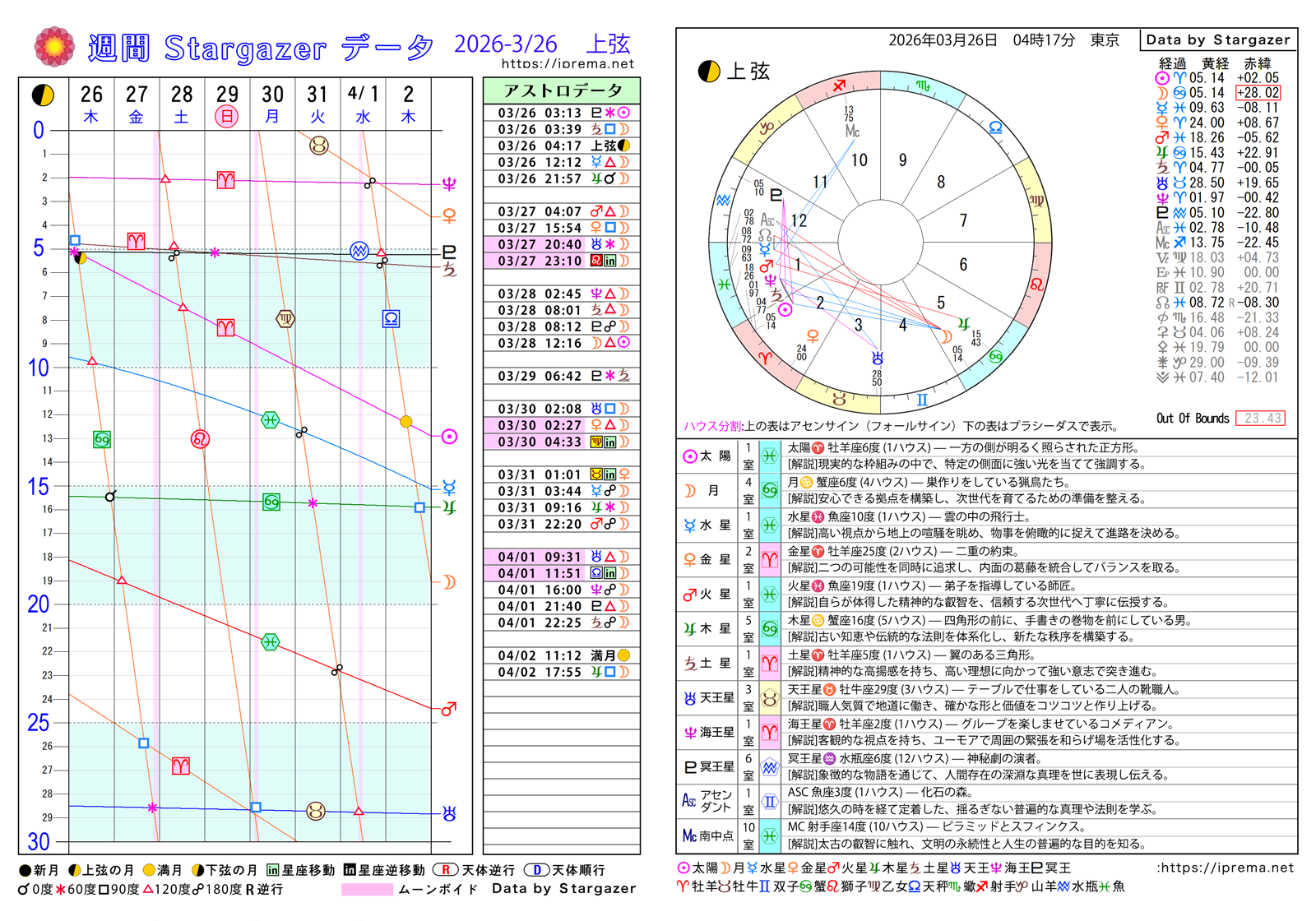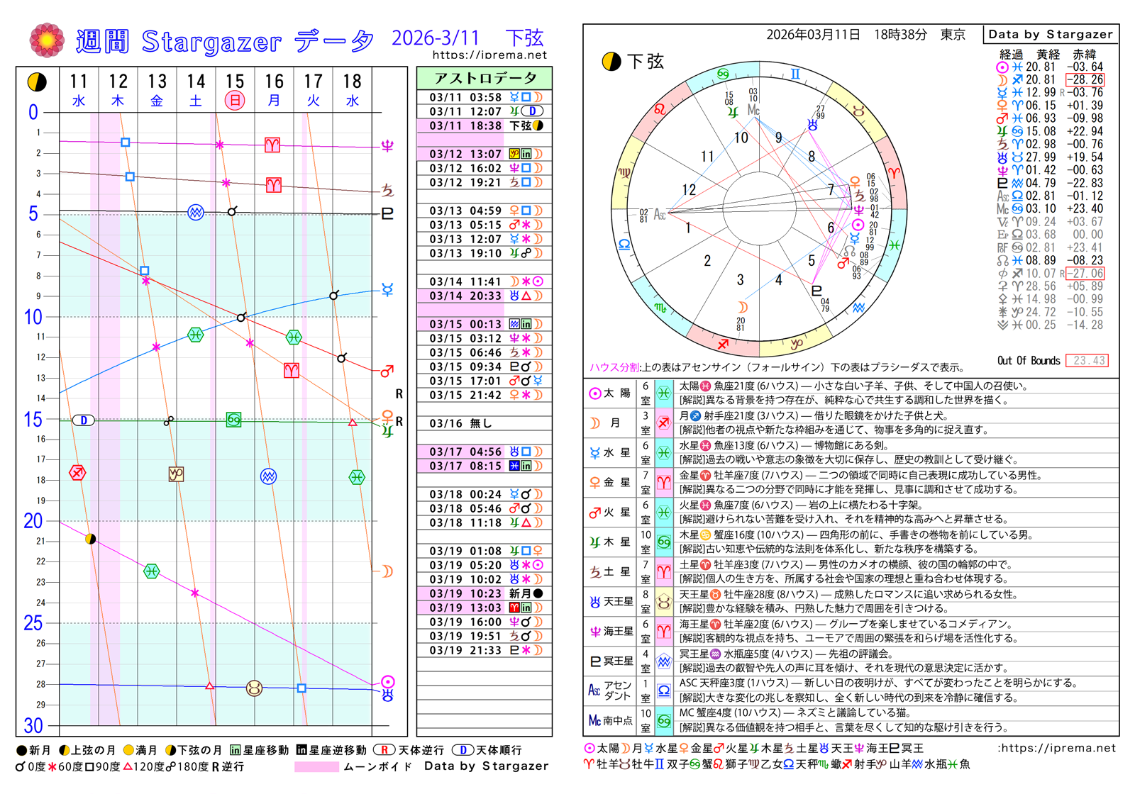 目次週間スターゲイザーデータ 2026/02 週間SGデータ よかったらシェアしてね! URLをコピーしました! 恒星の簡単な紹介 この記事を書いた人 愛プレマ 40代半ばより占星術を研究しています。途中仕事や子育てと学童の父母活動で進まない時期もありました。HPも一度は閉鎖してやり直している途中です。2022年より占いを専業として活動を再開しています。これからも色々な発表の場で活動したいと思います。 関連記事 週間スターゲイザーデータ 2026/01 2025年12月27日 週間Stargazerデータ、2025年9月 2025年6月16日 週間Stargazerデータ、2025年7月 2025年5月2日 週間Stargazerデータ、2025年6月 2025年5月2日 週間Stargazerデータ、2025年5月 2025年4月8日 週間Stargazerデータ、2025年4月 2025年3月30日 週間Stargazerデータ、2025年3月 2025年3月1日 週間Stargazerデータ、2025年2月 2025年1月6日 コメント コメントする コメントをキャンセルコメント ※ 名前 ※ メール ※ サイト 次回のコメントで使用するためブラウザーに自分の名前、メールアドレス、サイトを保存する。 Δ